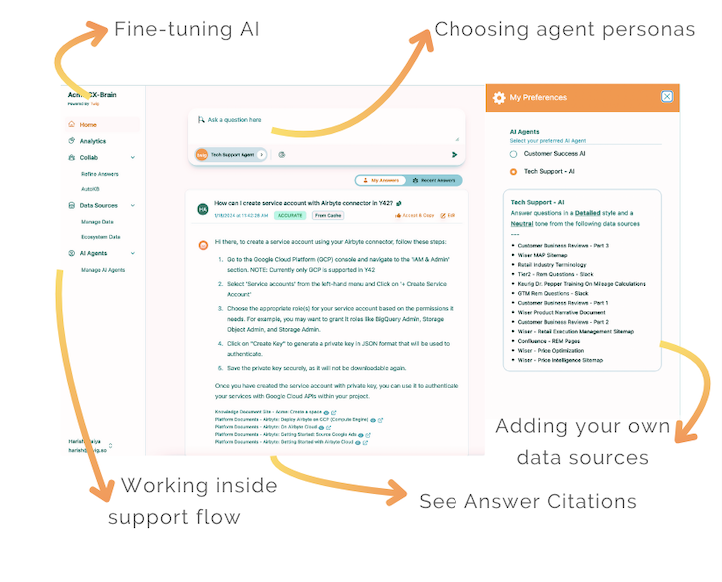 - Persona-based Data Sources: Different support roles interact with customers in distinct ways. For instance, support agents troubleshoot specific scenarios, while sales engineers engage with prospects, and customer success managers work with existing customers. AI must recognize these personas and tailor responses accordingly, drawing from relevant data sources to provide personalized assistance.